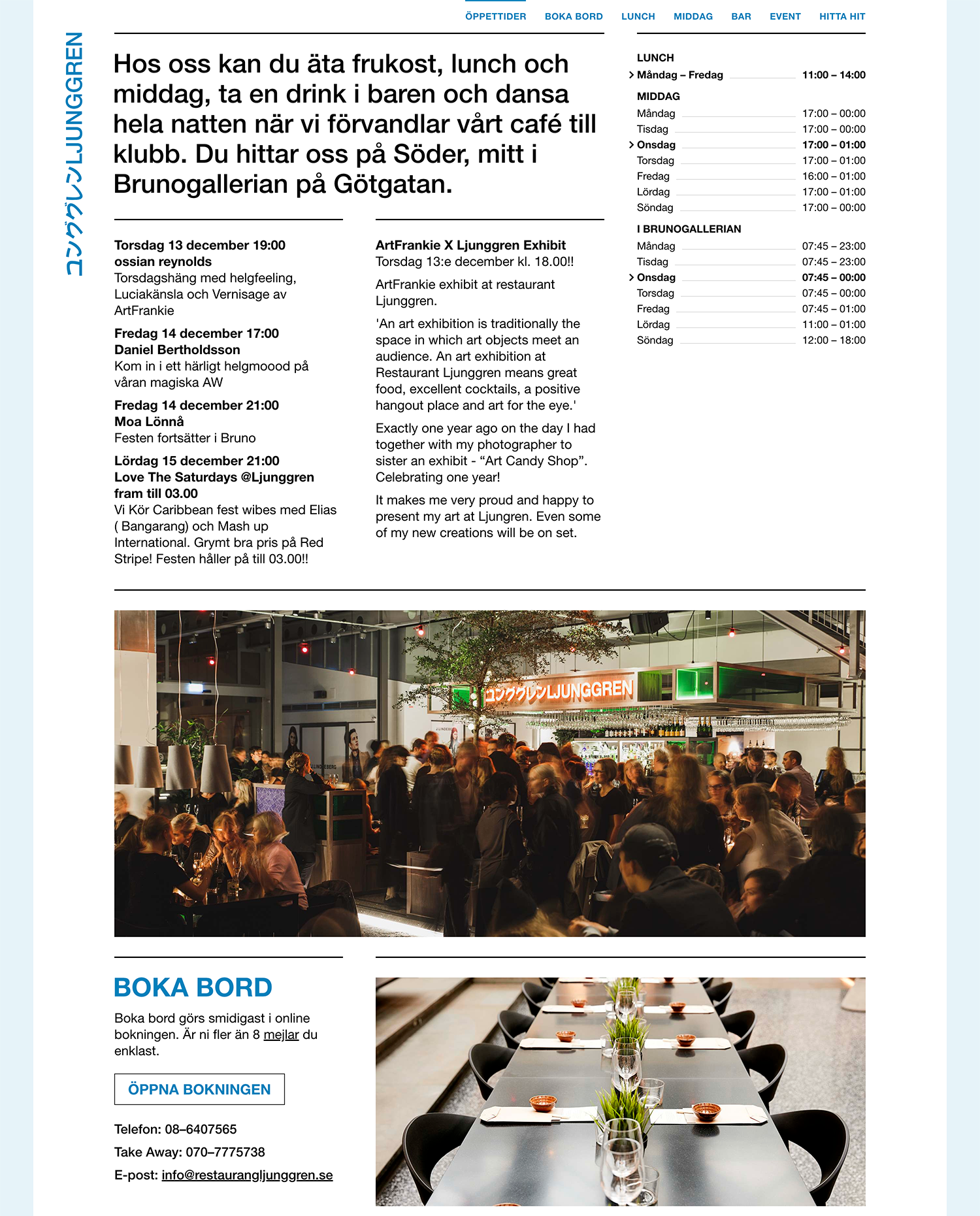 Vi har hjälpt våra vänner på Restaurang Ljunggren med en ny webbplats. Det blev en minimalistisk one pager med en härligt strikt grid i Swiss-design-anda. Vi lät Helvetican från loggan breda ut sig i både stort och smått vilket ger en självklar funktionell design. Tillsammans med lite smartness för hur vi visar öppettider och dagens lunch så blir det en effektiv webb som uppfyller besökarens behov av lättillgänglig information – och samtidigt inspirera med ett rikt bildmaterial.